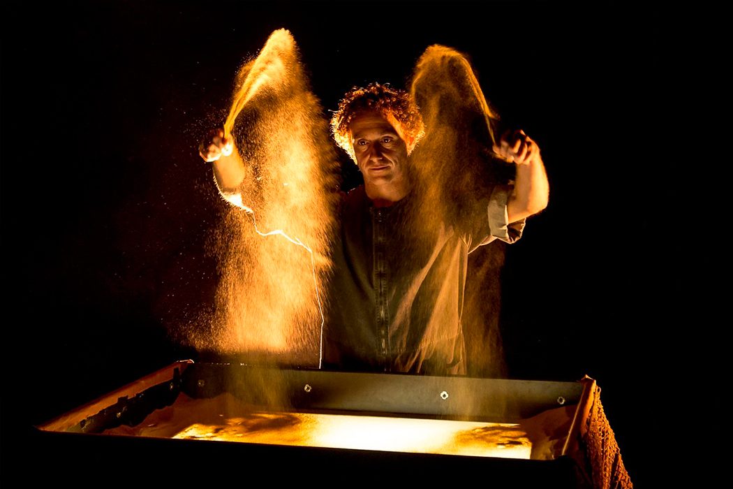 No és gaire habitual que un escenari s'ompli de sorra, ni que aquesta sorra serveixi per construir mons impossibles, delicats dibuixos fets a sobre d'un vidre i projectats en una pantalla per donar a l'espectador l'oportunitat de contemplar amb quina facilitat es poden construir i enderrocar. Música, titelles i acrobàcies s'afegeixen a aquest espectacle que esperona, com pocs, la imaginació.